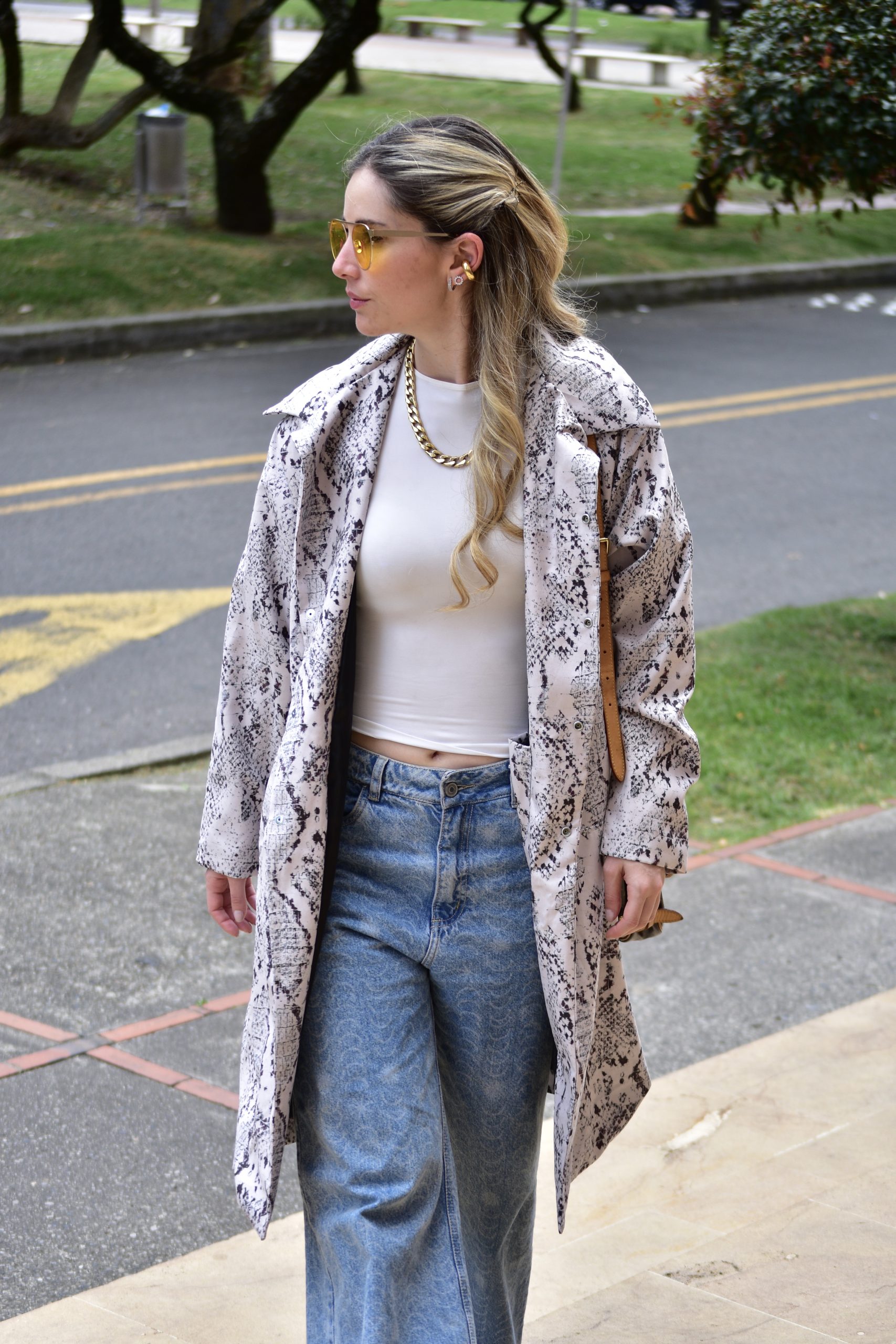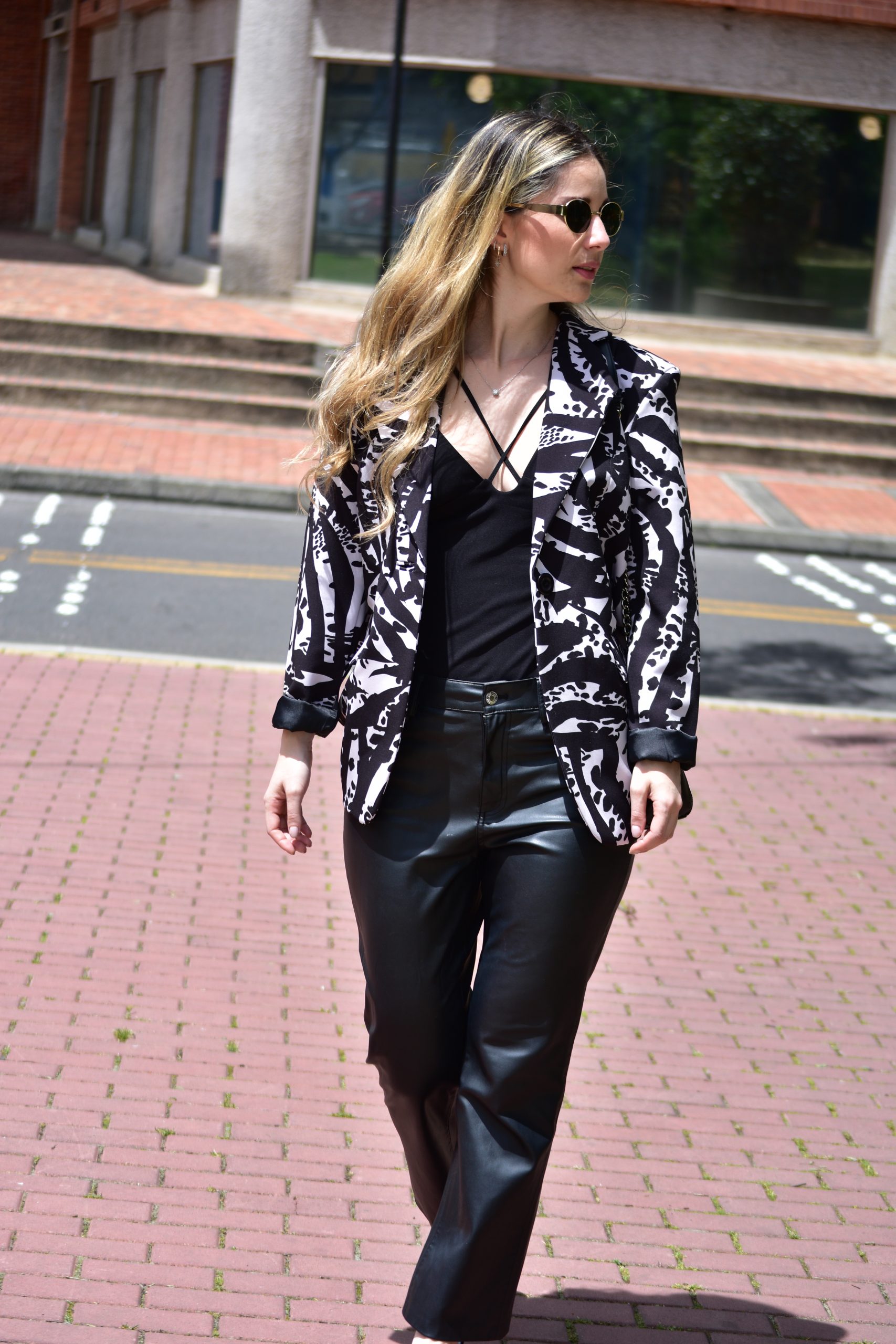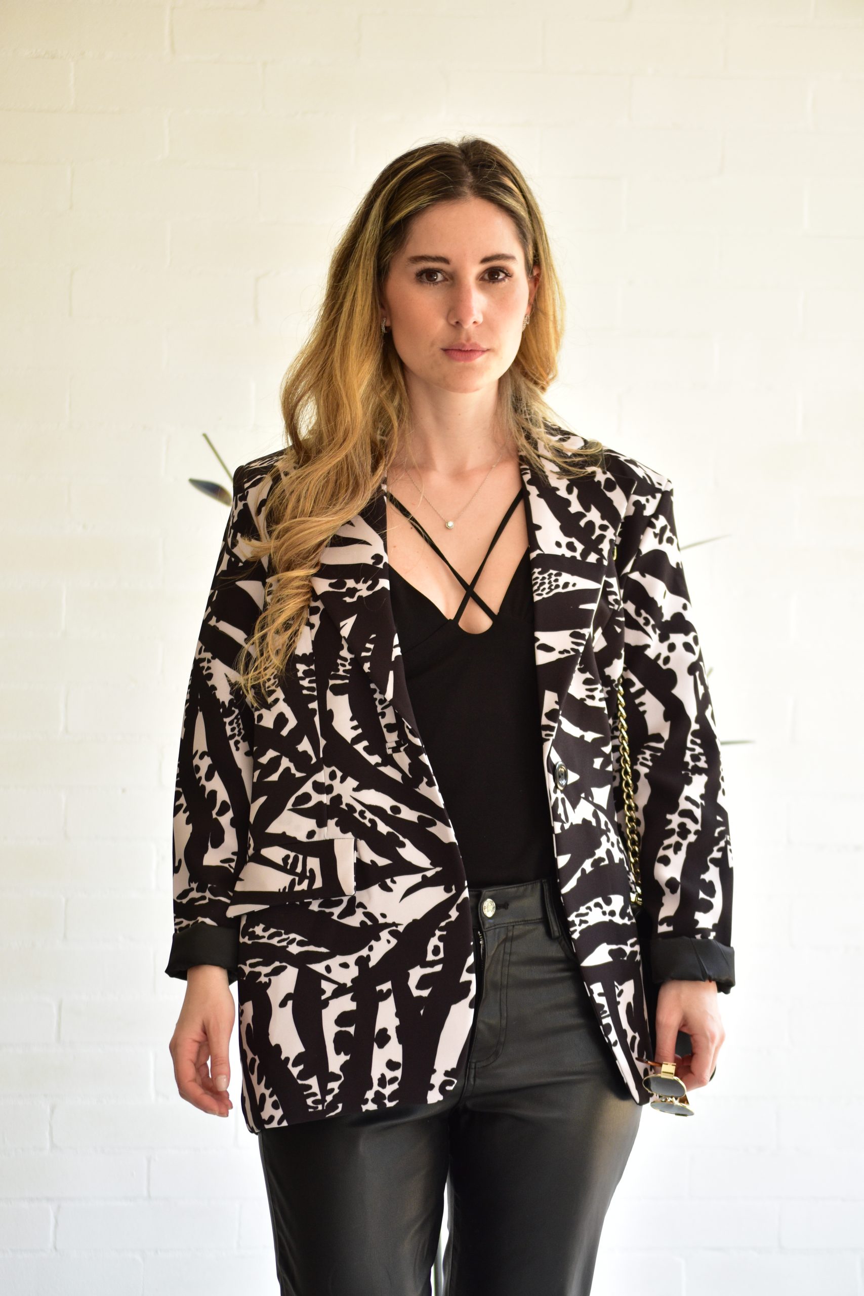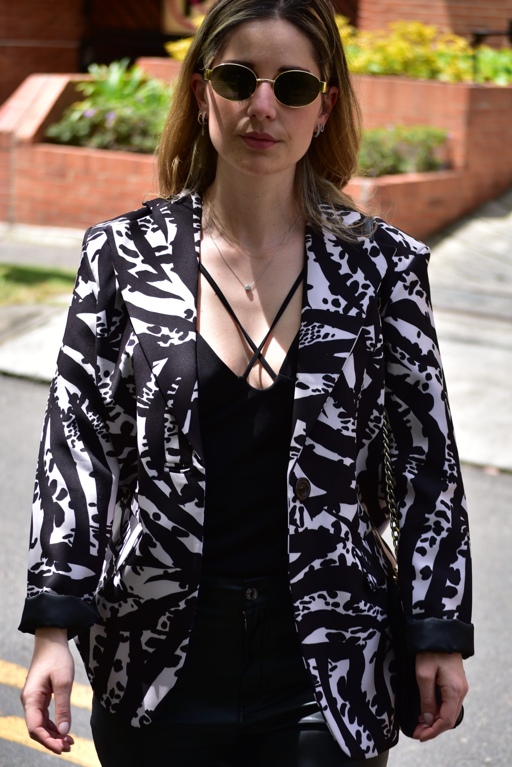 Blazer estampado oversize con diseño estructurado. Bolsillos delanteros y bolsillo interior. forro interior.